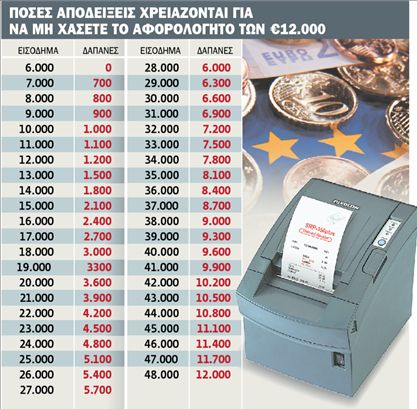Γ ια ατομικό εισόδημα ως έξι χιλιάδες ευρώ δεν απαιτείται η προσκόμιση αποδείξεων δαπανών. Οταν οι δαπάνες είναι περισσότερες από τις απαιτούμενες και ως δεκαπέντε χιλιάδες ευρώ ατομικά ή τριάντα χιλιάδων ευρώ για οικογένεια, ο φορολογούμενος δικαιούται και μείωση φόρου ίση με το 10% της διαφοράς μεταξύ των δηλούμενων και των απαιτούμενων δαπανών. Οταν οι δαπάνες είναι λιγότερες από τις απαιτούμενες, ο φορολογούμενος επιβαρύνεται με ποσοστό φόρου ίσο με το 10% του ποσού των δαπανών που υπολείπεται.