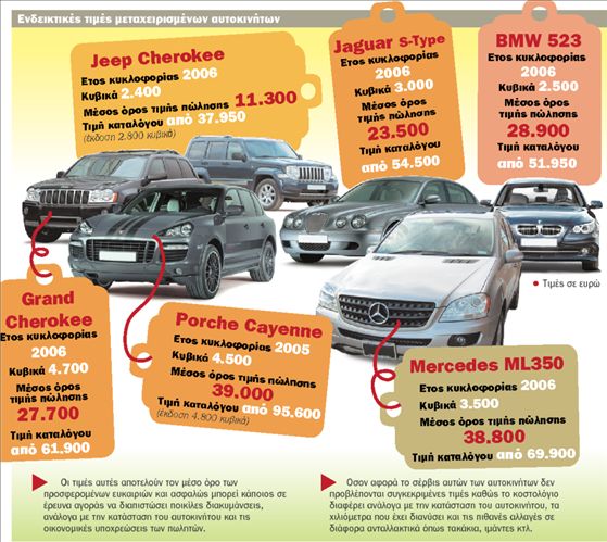 «Αυτή τη στιγμή στα μεταχειρισμένα αυτοκίνητα ο κόσμος έχει στραφεί προς τα λίγα κυβικά. Στα μεγάλα αυτοκίνητα πολυτελείας δεν κινείται τίποτε. Υπάρχει μεγάλη προσφορά και σχεδόν καθόλου ζήτηση» τονίζει ο κ. Αριστείδης Μπέσικος, εκπρόσωπος της εταιρείας Αuto Μπέσικος που δραστηριοποιείται στον χώρο από το 1985. «Οι τιμές των αυτοκινήτων πολυτελείας το τελευταίο εξάμηνο έχουν πέσει ως και 60%» λέει ο κ. Μπέσικος. «Για παράδειγμα, ένα Jeep Cherokee του 2005, το οποίο πέρυσι είχε τιμή 12.000-