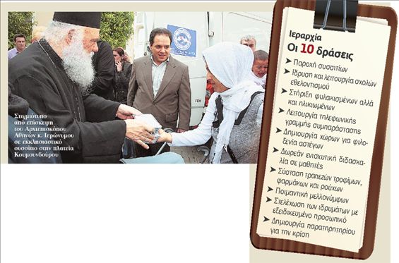 Δραματική χαρακτηρίζεται η αύξηση του αριθμού των Ελλήνων που προσφεύγουν καθημερινά στα συσσίτια της Εκκλησίας. «Από τις αρχές Σεπτεμβρίου οι Ελληνες αυξήθηκαν δραματικά» τονίζει χαρακτηριστικά στο «Βήμα» ο διευθυντής Οικονομικών του Φιλόπτωχου Ταμείου της Αρχιεπισκοπής, Αρχιμανδρίτης Χρυσόστομος Συμεωνίδης . «Η αναλογία είναι πλέον σχεδόν ίδια με τους μετανάστες» προσθέτει «καθώς υπάρχουν ανάγκες για την εξεύρεση δουλειάς, ιατροφαρμακευτικής περίθαλψης, σίτισης, στέγασης και παροχής βασικών ειδών πρώτης ανάγκης».