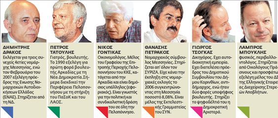 αυτοδιοικήσεις, ακόμη και εκεί όπου κατήρχοντο «αντάρτες υποψήφιοι» (Αργολίδα, Αρκαδία), ενώ στις βουλευτικές εκλογές του 2009, όταν το κόμμα υπέστη τη μεγαλύτερη ήττα στην ιστορία του, στον Μοριά διατήρησε την επιρροή του σε τρεις από τους πέντε νομούς (Μεσσηνία, Λακωνία, Αργολίδα). Το βάρος της εκλογής όμως που επωμίζεται ο κ. Δράκος έχει σχέση και με το γεγονός ότι αποτελεί προσωπική επιλογή του κ. Σαμαρά, ο οποίος κατάγεται από την ίδια περιφέρεια και τον επέλεξε παρ΄ ότι δεν είχε την αναγνωρισιμότητα άλλων στελεχών της κεντρικής πολιτικής σκηνής, που είχαν εκδηλώσει την επιθυμία να είναι υποψήφιοι. Ο κ. Τατούλης, από την άλλη πλευρά, συγκεντρώνει αντιφατικά πολιτικά χαρακτηριστικά: Προέρχεται από τον χώρο της εξωκοινοβουλευτικής Αριστεράς, ανέλαβε ή διεκδίκησε επιτελικές θέσεις στη ΝΔ, με την οποία εξελέγη επανειλημμένα βουλευτής, διαγράφηκε δύο φορές όταν δεν πειθάρχησε σε αποφάσεις του κόμματος, τοποθετήθηκε υπουργός Πολιτισμού και τελικά κήρυξε τον πόλεμο κατά του κ. Κ.Καραμανλή που τον επέλεξε για αυτή τη θέση. Σήμερα στηρίζεται από το ΠαΣοΚ και τον ΛΑΟΣ, ενώ συσπειρώνει γύρω του και οπαδούς της κυρίας Ντόρας Μπακογιάννη.