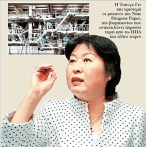 Η Τσανγκ Γιν είναι η πλουσιότερη, αλλά και η πιο διάσημη από τους «θηλυκούς κροίσους» της Κίνας. Στα53 της, είναι επικεφαλής μιας γιγαντιαίας εταιρείας ανακύκλωσης χάρτου, της Νine Dragons Ρaper, κύρια δραστηριότητα της οποίας είναι η εισαγωγή άχρηστου χαρτιού από τις ΗΠΑ και άλλες αναπτυγμένες χώρες, η μετατροπή του σε χαρτοπολτό και η κατασκευή χαρτονιού συσκευασίας για τα εξαγώγιμα προϊόντα της Κίνας. Η περιουσία της υπολογίζεται στα 4 δισ ευρώ. «Λεπτομέρεια»: στην εντυπωσιακή σταδιοδρομία της βοήθησαν ιδιαίτερα οι εξαιρετικές διασυνδέσεις του πατέρα της, μεγαλοστελέχους του ΚΚΚ και διευθυντή χαλυβουργίας, με την κομματική ιεραρχία.