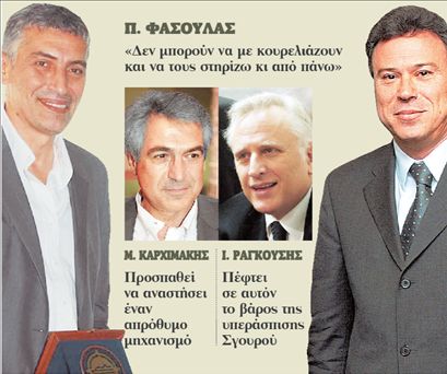 Σε μια εποχή όπου το ΠαΣοΚ χρειάζεται ενωμένες τις δυνάμεις του, επελέγη μια διαδικασία που προκάλεσε βαθιές πληγές και κανένας δεν είναι σε θέση να εξηγήσει τον λόγο. Εξηγήσεις αναζητεί και ο κ. Π. Φασούλας . «Ο κ.Καρχιμάκης δεν μου απάντησε αν υπάρχει κάποιο πρόβλημα που προκάλεσε τον εξοστρακισμό μου από τον Πειραιά» είπε μιλώντας στον «Βήμα FΜ». «Στην πολιτική σε στέλνουν σπίτι σου οι πολίτες,δεν σε στέλνει κανένα γραφείο και καμία επιτροπή. Δεν μπορούν να με κουρελιάζουν και να τους ψηφίζω κι από πάνω». Ο δήμαρχος Πειραιά επιβεβαίωσε ότι θα στηρίξει τον κ. Δημαρά, όχι όμως μπαίνοντας υποψήφιος αντιπεριφερειάρχης στον συνδυασμό του, και ότι δεν θα υποδείξει στους δικούς του ανθρώπους τι να πράξουν. Ωστόσο χθες έξι σύμβουλοί του προσχώρησαν στο ψηφοδέλτιο του κ. Δημαρά. Πρόκειται για τις κυρίες Ζωή Κεχαγιά, Κατερίνα Αναγνώστου, Σταυρούλα Καρύδη και τους κκ. Τ. Αβραμίδη, Δ. Παρασκευόπουλο και Δ. Βενέρη. Την επίσημη παρουσίαση του ψηφοδελτίου του κ. Ι. Σγουρού την ερχόμενη Δευτέρα στη Λυρική Σκηνή αποφάσισε χθες το επικοινωνιακό επιτελείο του ΠαΣοΚ για τις εκλογές στην Αττική, σε μια προσπάθεια να συσπειρωθούν ξανά ψηφοφόροι και κομματικός μηχανισμός. Στην εκδήλωση θα μιλήσουν ο υπουργός Εσωτερικών κ. Ι.Ραγκούσης και ο Γραμματέας του ΠαΣοΚ κ. Μ. Καρχιμάκης. Σύμφωνα με τον σχεδιασμό που έχει γίνει, ο κ. Ραγκούσης θα έχει ένα πρόγραμμα ομιλιών σε διάφορους δήμους της Αττικής ώστε αφενός να στηρίξει το ψηφοδέλτιο του κ. Σγουρού, αφετέρου να εξηγήσει ποιες αλλαγές θα επιφέρει η μεταρρύθμιση του «Καλλικράτη». Οι εκδηλώσεις αυτές έχει σχεδιαστεί να γίνουν σε «τρικυμισμένες» περιοχές και η συμμετοχή του κόσμου ίσως να αποτελέσει ένα πρώτο δείγμα για το αποτέλεσμα της κάλπης, καθώς πολλοί προβλέπουν μεγάλη αποχή.