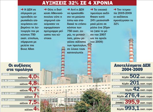 Με 1 δισ. ευρώ κέρδη το 2009 και με αυξήσεις τιμολογίων συνολικά 32% την περίοδο 2005-2009 η ΔΕΗ εξακολουθεί να στηρίζεται στις ανατιμήσεις που πληρώνουν οι καταναλωτές. Η πολιτική εφησυχασμού με τις συνεχείς αυξήσεις τιμολογίων την περίοδο αυτή άφησε ανεξέλεγκτες τις λειτουργικές δαπάνες, οι οποίες μετακυλίονταν στους καταναλωτές, ενώ οι διοικήσεις της ΔΕΗ θα έπρεπε να τρέχουν πίσω από τη μείωση του κόστους.