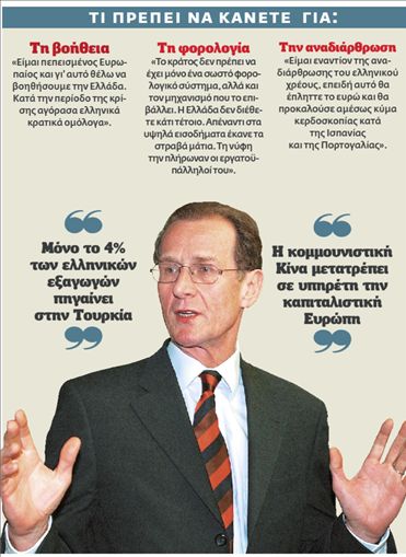 Η Ελλάδα, τονίζει, πρέπει να εισαγάγει νέο μοντέλο ανάπτυξης, που δεν θα στηρίζεται σε ακάλυπτες διακηρύξεις και επιταγές, αλλά σε πραγματικά κερδοφόρους κλάδους, όπως οι εξαγωγές, ο τουρισμός, η ναυτιλία και η ελαφρά βιομηχανία. Μόνο έτσι θα ξανακερδίσει την εμπιστοσύνη των αγορών, που προς το παρόν παραμένουν εμφανώς δύσπιστες. Οι εξαιρέσεις δεν λείπουν βέβαια. Παράδειγμα, η Κίνα, η οποία, παρά την κρίση, τοποθετεί όλο και περισσότερα κεφάλαια στην Ελλάδα. Η τοποθέτησή τους όμως, παρατηρεί, δεν είναι ανιδιοτελής, αλλά αποβλέπει ευθέως στην ταχύτερη διακίνηση των κινεζικών εμπορευμάτων στην Κεντρική και Ανατολική Ευρώπη. Αυτό εξηγεί κατά τα άλλα και το γεγονός ότι το μεγαλύτερο μέρος των πιστώσεων δίνεται σε έλληνες εφοπλιστές. « Ανάποδος κόσμος » λέει. « Η κομμουνιστική Κίνα μετατρέπει σε υπηρέτη την καπιταλιστική Ευρώπη ».