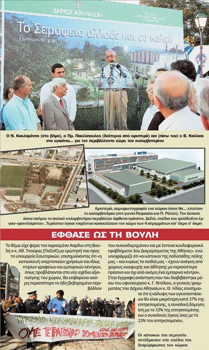 Στην (προεκλογική) ιστοσελίδα του «γαλάζιου» υποψήφιου περιφερειάρχη Αττικής- και συνεργάτη του δημάρχου Αθηναίων κ. Ν.Κακλαμάνη ως πρόσφατα με την ιδιότητα του προέδρου του Οργανισμού Νεολαίας και Αθλησης του δήμου- κ. Β. Κικίλια φιγουράρει η φωτογραφία από τα εγκαίνια «του αναδιαμορφωμένου χώρου στο Σεράφειο Κολυμβητήριο» (της οδού Πειραιώς και Π. Ράλλη), τον Ιούνιο του 2008. Λεπτομέρεια: «Σεράφειο Κολυμβητήριο» δεν υφίσταται! Οι παράτες και τα ταρατατζούμ, παρουσία και του τότε (υπερ)υπουργού Εσωτερικών κ. Πρ.Παυλόπουλου, αφορούσαν τις παρεμβάσεις που έγιναν στον περιβάλλοντα χώρο τού πολλάκις εξαγγελθέντος κολυμβητηρίου, για την κατασκευή του οποίου μάλιστα υπεγράφησαν στο παρελθόν όχι μία, αλλά δύο προγραμματικές συμβάσεις μεταξύ Δήμου Αθηναίων και Γενικής Γραμματείας Αθλητισμού, ύψους αρκετών εκατομμυρίων ευρώ!