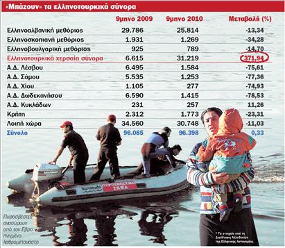 Η αύξηση στη φύλαξη των θαλασσίων συνόρων μας με την Τουρκία, με τη συμμετοχή δυνάμεων της Frontex, οδήγησε τους μετανάστες στα χερσαία σύνορά μας και ξανά στον Εβρο. Το ποτάμι, που οριοθετεί φυσικά τα σύνορα Ελλάδας και Τουρκίας, αποτελεί πλέον τη «δημοφιλέστερη» είσοδο παράνομων μεταναστών στη χώρα μας καθώς σχεδόν καθημερινά πέφτουν στα χέρια των αστυνομικών περισσότερα από 100 άτομα. Μάλιστα, σύμφωνα με στοιχεία που δόθηκαν χθες στη δημοσιότητα, το πρώτο εννεάμηνο του 2010 σε σχέση με το αντίστοιχο χρονικό διάστημα πέρυσι παρατηρήθηκε αύξηση στον αριθμό των συλληφθέντων μη νόμιμων μεταναστών κατά 371,94%. Αυτοί είναι οι «τυχεροί» γιατί επέζησαν. Το καλοκαίρι 16 άνθρωποι έχασαν τη ζωή τους κολυμπώντας στον ποταμό προσπαθώντας να φθάσουν στην ελληνική όχθη. Ενας από τους λόγους που πλέον οι διακινητές ανθρώπων επιλέγουν τα χερσαία ελληνοτουρκικά σύνορα είναι ότι υπήρξε καθαρισμός των παλαιών ναρκοπεδίων στην ελληνική πλευρά. Επίσης το «πέρασμα» είναι πιο φθηνό από ό,τι από τα νησιά του Βόρειου και Ανατολικού Αιγαίου. Ο μη νόμιμος μετανάστης για να περάσει τον Εβρο πληρώνει ένα ποσό της τάξεως των 300-400 ευρώ. Το ποσό όμως που δίνει για το ταξίδι προς τη Μυτιλήνη ή προς άλλα νησιά είναι τριπλάσιο ή και τετραπλάσιο.
