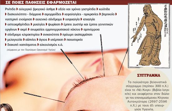 Δεν είναι βέβαιο αν μία συνεδρία βελονισμού στο Πεκίνο είναι πιο αποτελεσματική από αυτή σε ένα ιατρικό κρεβάτι στην Αθήνα. Είναι όμως σίγουρα πιο παραδοσιακή, καθώς οι Κινέζοι εφαρμόζουν την τέχνη περίπου από το 2500 π.Χ. Σε μεγάλο ποσοστό βέβαια, ακόμη και σήμερα οι παθήσεις τους διαγιγνώσκονται σύμφωνα με τις αρχές της παραδοσιακής κινεζικής ιατρικής (π.χ. χρώμα επιδερμίδας), οι οποίες καμία σχέση δεν έχουν με τη φιλοσοφία της δυτικής επιστημοσύνης. Ετσι λοιπόν στη Δύση, ο υποψήφιος φτάνει στο ιατρείο βελονισμού με τα αποτελέσματα ιατρικών εξετάσεων και εργαστηριακών ελέγχων στο χέρι. Από εκεί και πέρα λαμβάνεται ιστορικό, γίνεται συζήτηση με τον γιατρό και τότε μόνο ξεκινά η πρώτη συνεδρία.
