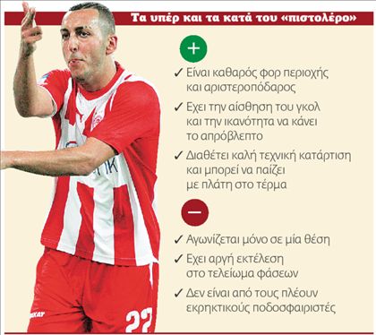 Χωράει ο «πιστολέρο» του Ολυμπιακού στην ομάδα; Αξίζει να πάρει ευκαιρίες από τον προπονητή του; Σίγουρα πρέπει να βελτιώσει κάποια στοιχεία του παιχνιδιού του, όπως η ταχύτητα στην εκτέλεση, η ομαδικότητα και η αποτελεσματικότητα στο ψηλό παιχνίδι. Πρόκειται για κλασικό επιθετικό κρούσης, που έχει την αίσθηση του γκολ, έχει αποδείξει ότι μπορεί να αντεπεξέλθει στα δύσκολα παιχνίδια και στις υψηλές απαιτήσεις και ασφαλώς έχει περιθώρια να γίνει ακόμη καλύτερος, ώστε να «προβληματίσει» τον προπονητή του. Αυτή τη στιγμή οι βασικοί υποψήφιοι για τη μοναδική θέση προωθημένου είναι οι Μιραλάς και Πάντελιτς, ενώ ο Μήτρογλου αντιμετωπίζει σίγουρα την πιο μεγάλη πρόκληση στην ως τώρα ερυθρόλευκη καριέρα του.