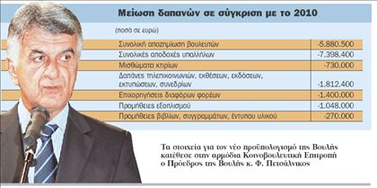 Συνολικά για τη Βουλή ο προϋπολογισμός του 2011 προβλέπει πιστώσεις ύψους 197.988.000 ευρώ έναντι 218.092.200 που ήταν ο προϋπολογισμός του 2010, ο οποίος είχε επίσης μειωθεί κατά 3.887.000 ευρώ σε σχέση με το 2009. Στόχος είναι να σταλεί «σαφές μήνυμα για συνέχιση της προσπάθειας επίτευξης του στόχου αντιμετώπισης του δημοσιονομικού προβλήματος της χώρας με την περαιτέρω αποκλιμάκωση του ελλείμματος του κρατικού προϋπολογισμού».