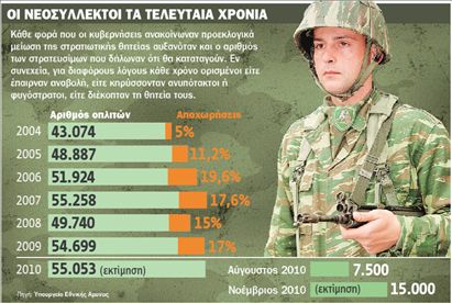 νέους να στραφούν προς τη σιγουριά και την ασφάλεια των Ενόπλων Δυνάμεων. Θα παραμείνουν στον Στρατό, μεσούσης της οικονομικής κρίσης επί εννέα μήνες (για όσους υπηρετούν στην Αεροπορία ή στο Ναυτικό 12 μήνες), περιμένοντας να δουν πώς θα εξελιχθεί η κατάσταση. Επιπλέον ο χρόνος της θητείας, των εννέα δηλαδή μηνών, αποτελεί μεγάλο κίνητρο για να εκπληρώνουν μια κι έξω τις στρατιωτικές υποχρεώσεις τους.