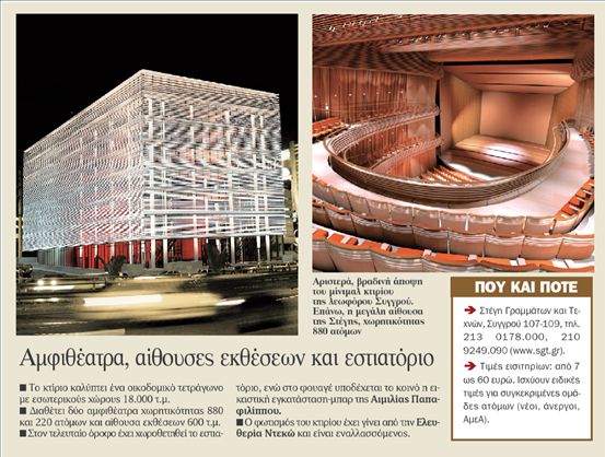 Πρώτη γνωριμία με το κτίριο της Στέγης Γραμμάτων και Τεχνών του Ιδρύματος Ωνάση χθες το μεσημέρι στη βροχερή λεωφόρο Συγγρού και μαζί η παρουσίαση ολόκληρου του προγράμματός της για το 2010-2011. Εντυπωσιακά και τα δύο. Γυαλί και ατσάλι για το ανάλαφρο, διάφανο κτίριο, με τον εμφανή σκελετό του και τη μίνιμαλ αισθητική να κυριαρχούν- σε αντίθεση με τις δύο ατμοσφαιρικές σκηνές-, πλούσιο το πρόγραμμα, το οποίο καλύπτει όλες τις τέχνες και τα γράμματα με έμφαση στην ελληνική δημιουργία και στους νέους.