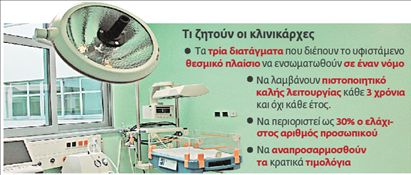 Ενα άλλο θέμα εκτός από τον αριθμό του προσωπικό που θέλουν οι κλινικάρχες να αλλάξουν είναι να λαμβάνουν βεβαίωση καλής λειτουργίας κάθε τρία χρόνια και όχι κάθε έτος. Η ένστασή τους είναι ότι πρόκειται για μια γραφειοκρατική διαδικασία που καθυστερεί και πολλές φορές λόγω της καθυστέρησης λήψης της βεβαίωσης δεν μπορούν να συνεργαστούν με ασφαλιστικά ταμεία.