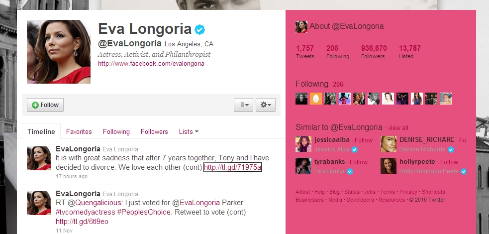 έγραψε η Εύα Λονγκόρια στο Twitter, προχθές το απόγευμα. Δίνοντας με αυτό τον τρόπο τέλος στις αντικρουόμενες φήμες των τελευταίων ημερών: εκ των οποίων άλλες την ήθελαν να εγκαταλείπει τον σύζυγό της, τον μπασκετμπολίστα Τόνι Πάρκερ, και άλλες παρουσίαζαν τα περί ρήξεως ως κακοήθεις διαδώσεις των… εχθρών του ζεύγους. Να όμως που η ρήξη είναι οριστική. Λέγεται, μάλιστα, ότι η 35χρονη λατίνα σταρ του σήριαλ «Νοικοκυρές σε απόγνωση» βρέθηκε κυριολεκτικά σε απόγνωση όταν ανακάλυψε δεκάδες πονηρά μηνύματα στο κινητό τηλέφωνο του 28χρονου συζύγου της, με αποστολέα τη σύζυγο συμπαίκτη του.
