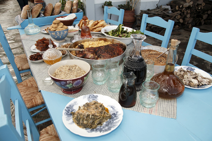 Πηγαίνουμε λοιπόν στο νησί καλεσμένοι του αντιδημάρχου Νίκου Λύκου και φτάνουμε ακριβώς την ώρα που στρώνεται το τραπέζι με νοστιμιές απίστευτες. Ο Ανδρέας αρχίζει την περιήγηση στην τοπική κουζίνα που απλώνεται μπροστά μας. Πλάτη κατσικιού γεμιστή, μπουρέκια με κολοκύθα και δερματοτύρι (τυρί φυλαγμένο σε δέρμα ζώου), τσιγαριαστές παπαρούνες με ταραμά, «γιορτή» με κατσίκι και σιτάρι, κατιμέρια (δηλαδή τηγανίτες που τρώγονται με κατσικίσιο τυρί ή με λιαστό πετιμέζι), μουσταλευριά φρέσκια αλλά και ξερή που στεγνώνει στον ήλιο, πασπαλάς (χοιρινό παστό σε φέτες), κρεμμυδοντολμάδες, ελιές χαμάδες, ξερά σύκα, σταφίδες από ροζακί, ξερές μακαρόνες (μοιάζουν με τα μελομακάρονα) και βέβαια άφθονο κρασί ξηρό και γλυκό και σούμα (ντόπιο τσίπουρο) που φτιάχνονται από την αρωματική ποικιλία μοσχάτο.