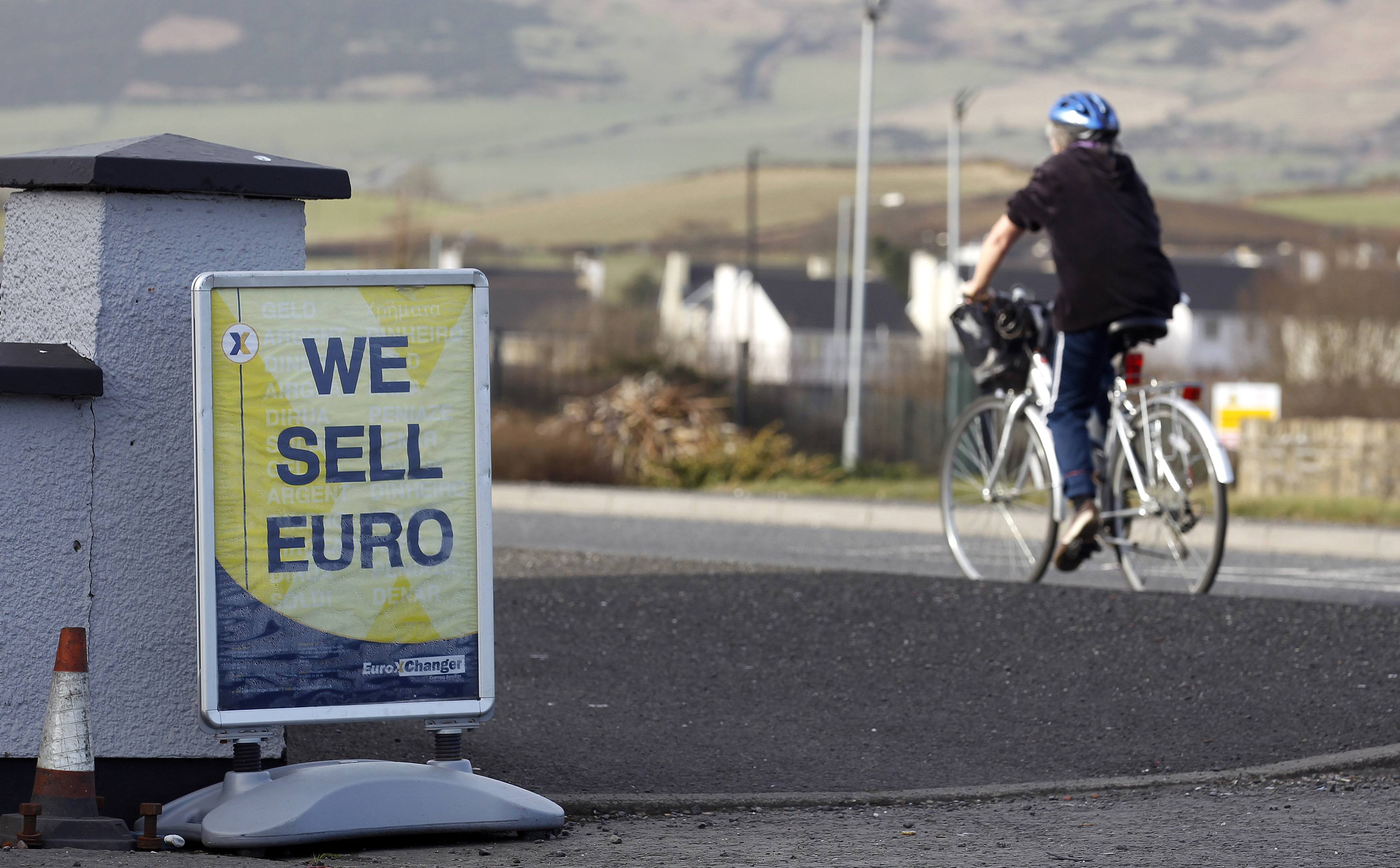 A woman cycles past a sign near a fuel station in Bridgeend in Ireland February 28, 2011. Irish opposition parties started coalition talks on Monday after a resounding election win gave them the mandate to renegotiate an EU-IMF rescue deal they fear will bankrupt the former "Celtic Tiger" economy. REUTERS/Cathal McNaughton (IRELAND - Tags: POLITICS BUSINESS) (File: CMN02_IRELAND-VOTE-_0228_11.JPG )