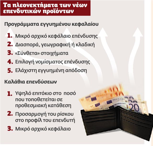 Νέα ελκυστικά επενδυτικά προϊόντα έχουν λανσάρει τους τελευταίους μήνες οι τράπεζες, δίνοντας πρόσβαση στις διεθνείς αγορές με ταυτόχρονη δυνατότητα ελέγχου του αναλαμβανόμενου κινδύνου, ο οποίος μπορεί να προσαρμοστεί στα μέτρα τους καθενός. Πρόκειται για προγράμματα που απευθύνονται ακόμη και σε μικρά «πορτοφόλια», τα οποία προσφέρουν στους έλληνες αποταμιευτές εργαλεία επενδύσεων τα οποία πριν από μερικά χρόνια εδιατίθεντο μόνο σε πελάτες του private banking. Παρά τη διατήρηση των ευρωπαϊκών επιτοκίων σε ιστορικά χαμηλά, η διαμόρφωση των αποδόσεων στις προθεσμιακές καταθέσεις στην Ελλάδα στα υψηλότερα επίπεδα από την εισαγωγή του ευρώ, αναγκάζει τα πιστωτικά ιδρύματα να διαμορφώσουν τους όρους των πιο ριψοκίνδυνων προϊόντων στις τρέχουσες συνθήκες, ώστε να καταστούν ανταγωνιστικά σε σχέση με τους ασφαλέστερους τραπεζικούς λογαριασμούς. Οπως επισημαίνουν παράγοντες της αγοράς, μέσα στο τρέχον περιβάλλον οι τράπεζες δίνουν ιδιαίτερη έμφαση στη δημιουργία έξυπνων και επίκαιρων επενδυτικών concepts, που ενσωματώνονται σε προγράμματα με εγγύηση στο αρχικό κεφάλαιο, ενώ δημοφιλή καθίστανται εκ νέου και τα καλάθια επενδύσεων τα οποία μπορούν να προσαρμοστούν στις ανάγκες και στις επιθυμίες κάθε επενδυτή. Οι ίδιοι κύκλοι σημειώνουν ότι τα προϊόντα αυτά απευθύνονται κυρίως σε όσους δεν είναι διατεθειμένοι να αναλάβουν ρίσκο και ως εκ τούτου η ζήτησή τους είναι λογικό να μειώνεται όταν αυξάνονται οι αποδόσεις των λογαριασμών με εξασφαλισμένη την τελική απόδοση, όπως είναι οι καταθέσεις προσυμφωνημένης διάρκειας.
