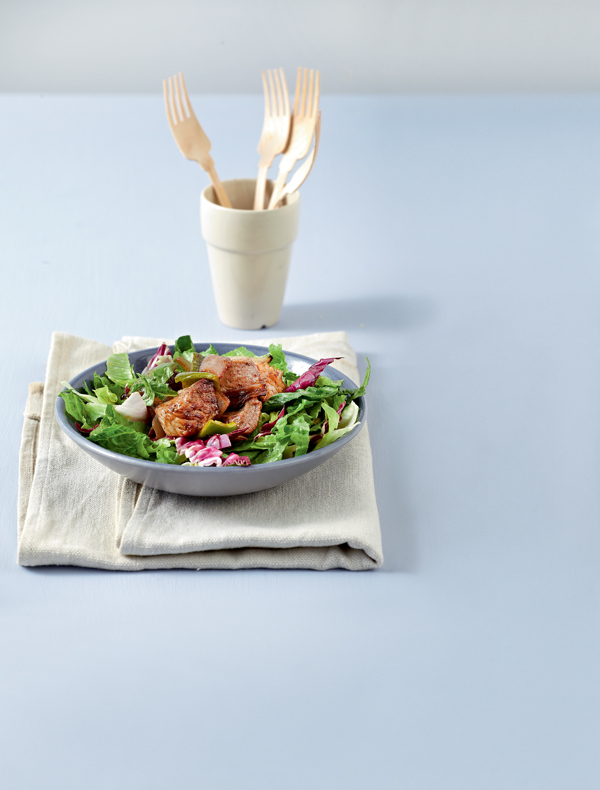 Σε μια σαλατιέρα αδειάζουμε τη σαλάτα. Από πάνω βάζουμε τις μπουκιές χοιρινού και περιχύνουμε με τη σάλτσα τους.