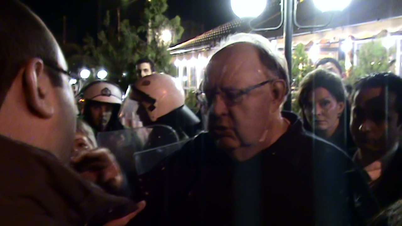 Στις 9 το βράδυ που πήγε στην ταβέρνα μαζί με τους 11 βουλευτές δεν είχε συγκεντρωθεί κανένας έξω από αυτήν. Γύρω στις 11 ειδοποιήθηκαν, από κάποιον του Δημοτικού Συμβουλίου ο οποίος έδωσε και το σύνθημα: «Βγήκα αμέσως έξω και μίλησα μαζί τους.Τους ρώτησα για τα αιτήματά τους. Μου είπαν ότι δεν είναι έτοιμοι και ξαναμπήκα στην ταβέρνα. Μετά από 10 λεπτά όταν βγήκα κάποιοι μου πέταξαν ένα μπουκάλι νερό. Δεν με πέτυχε. Στελέχη του ΣΥΡΙΖΑ άρχισαν τότε να υβρίζουν εμένα και τη γυναίκα μου. Ξαφνικά κάποιος πέταξε ένα γιαούρτι.Το σκουπίζω από το πρόσωπό μου και τότε κάποιος πέταξε προς το μέρος μου μια πλαστική καρέκλα που την έφαγα στον ώμο. Πόνεσα … Και εν συνεχεία», όπως είπε, «επιτέθηκαν φραστικά και εναντίον της Χριστίνας». «Δέχθηκε ύβρεις, συνοδευόμενες από άσεμνες παλμικές κινήσεις. Φώναζαν ότι έφυγε σαν κότα».