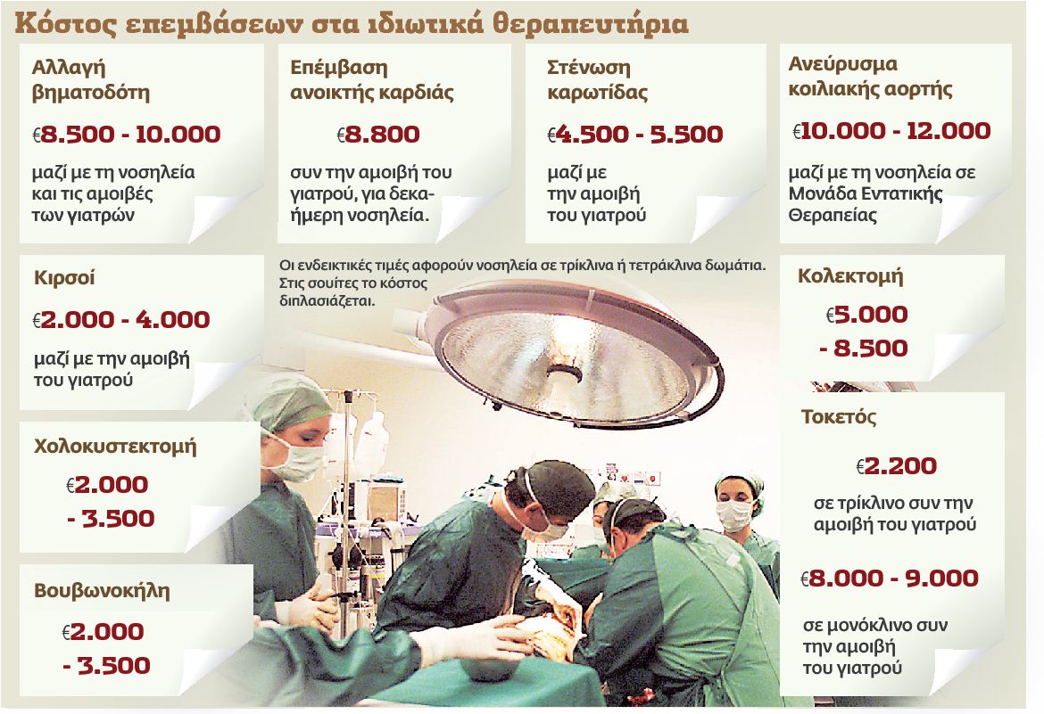 Η δουλειά στα χειρουργεία των ιδιωτικών νοσοκομείων και η κίνηση στα ιδιωτικά ιατρεία έχουν μειωθεί αισθητά, αναφέρει ο νευροχειρουργός, γενικός γραμματέας του Ιατρικού Συλλόγου Αθηνών (ΙΣΑ) κ. Γ. Ελευθερίου. «Τα χειρουργεία έχουν πληγεί, λόγω κρίσηςγενικότερα» σημειώνει. Και προσθέτει: «Στα ιδιωτικά πραγματοποιούνται λιγότερες βαριές επεμβάσεις που έχουν υψηλό κόστος σε σχέση με το παρελθόν. Για αυτές ο ασθενής