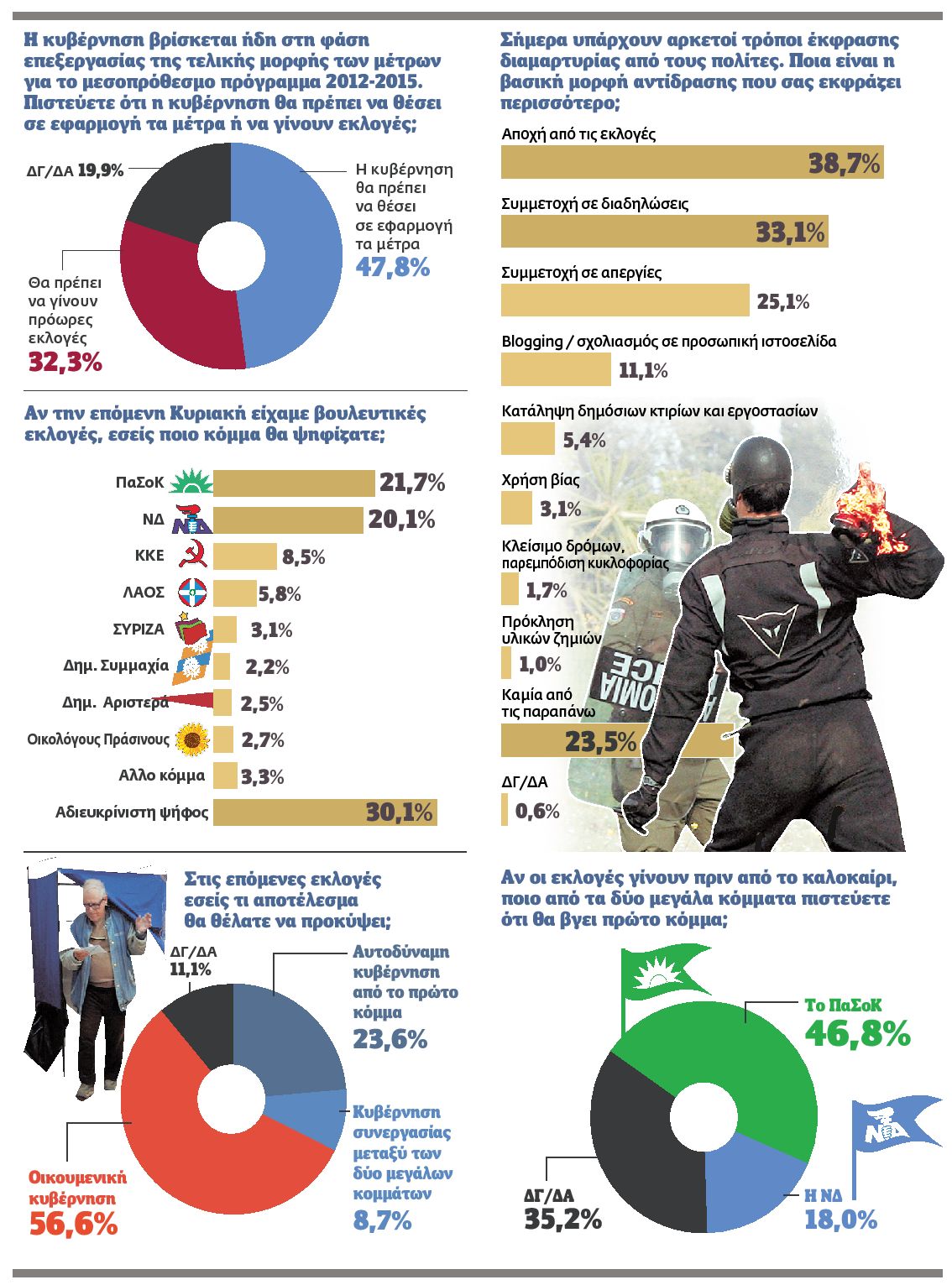 Την ίδια στιγμή οι έλληνες πολίτες, που παλαιότερα προτιμούσαν ισχυρές μονοκομματικές κυβερνήσεις, τώρα δηλώνουν ότι προτιμούν μια οικουμενική κυβέρνηση (56,6%), έναντι ενός ποσοστού 23,6% που προτιμά να έχει αυτοδυναμία το πρώτο σε ψήφους κόμμα και ενός ποσοστού 8,7% που επιθυμεί μια συνεργασία των δύο μεγαλύτερων κομμάτων. Δεκαεννέα μήνες μετά τις εθνικές εκλογές, το ΠαΣοΚ δείχνει να έχει χάσει τη δυναμική του, με την οποία πληρώνει το πολιτικό κόστος από τη μείωση του οικογενειακού εισοδήματος των Ελλήνων, αλλά και από την αδράνεια του κράτους. Από την πτώση αυτή όμως δεν επωφελείται ούτε κατ΄ ελάχιστον η ΝΔ, με αποτέλεσμα τα δύο κόμματα να υπερβαίνουν μετά βίας το 40% στις προτιμήσεις της κοινής γνώμης. Ως προσφορότερα μέσα αντίδρασης στο τέλμα που διαπιστώνουν στην πολιτική και στην οικονομική ζωή της χώρας, οι πολίτες επιλέγουν την αποχή από τις επόμενες εκλογές αλλά και τη συμμετοχή σε διαδηλώσεις και απεργίες.