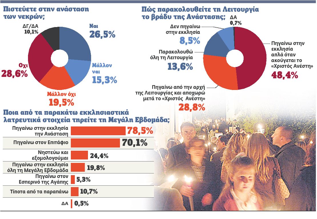 Στο ίδιο μήκος κύματος κινούνται και οι απαντήσεις που δίδονται στην ερώτηση «Το βράδυ της Ανάστασης παρακολουθείτε όλη τη Θεία Λειτουργία, πηγαίνετε από την αρχή της Λειτουργίας και αποχωρείτε μετά το “Χριστός Ανέστη” ή προτιμάτε να πηγαίνετε απλά όταν ακούγεται το “Χριστός Ανέστη”;» το 48,4% λέει «πηγαίνω απλά όταν ακούγεται το “Χριστός Ανέστη”», το 28,8% «πηγαίνω από την αρχή της Θείας Λειτουργίας και αποχωρώ μετά το “Χριστός Ανέστη”» και το 8,5% δηλώνει ότι «δεν πηγαίνω στην εκκλησία». Μόνο το 13,6% λέει ότι παρακολουθεί όλη τη Θεία Λειτουργία.