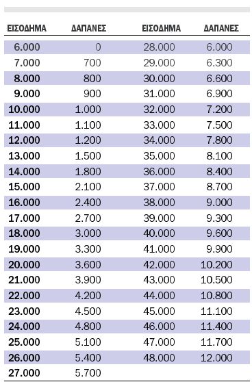 Παρατίθεται πίνακας με το ελάχιστο ύψος των απαιτούμενων δαπανών για εισόδημα ως 48.000