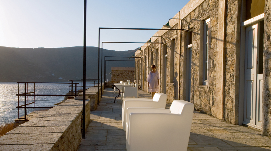 Αλλά και επειδή ο Γιώργος Ζαφειρίου, λάτρης του νησιού εδώ και μία τριακονταετία, μετέτρεψε με πιστή ανακατασκευή τούς 30 μ. μήκους και 4 μ. πλάτους εργατικούς κοιτώνες σε έναν μονόχωρο, αφήνοντας την πέτρα των εσωτερικών τοίχων ελεύθερη να διαγράφεται ασβεστωμένη και τα ανοίγματα – πόρτες και παράθυρα – στη σειρά, για να μη κρύβεται η γύρω ομορφιά.