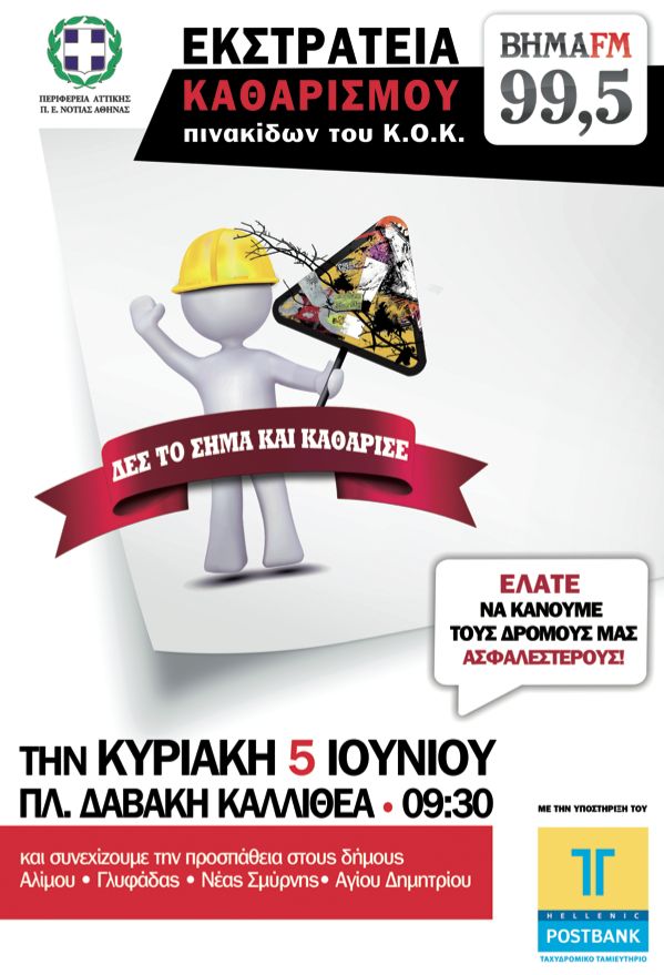 Ο ΒΗΜΑ FM 99,5 , σε συνεργασία με τον Νότιο Τομέα της Περιφέρειας Αττικής, διοργανώνει αυτή την Κυριακή δράση, με σκοπό να καθαριστούν από κάθε λογής αυτοκόλλητα και διαφημιστικά, τα σήματα κυκλοφορίας.