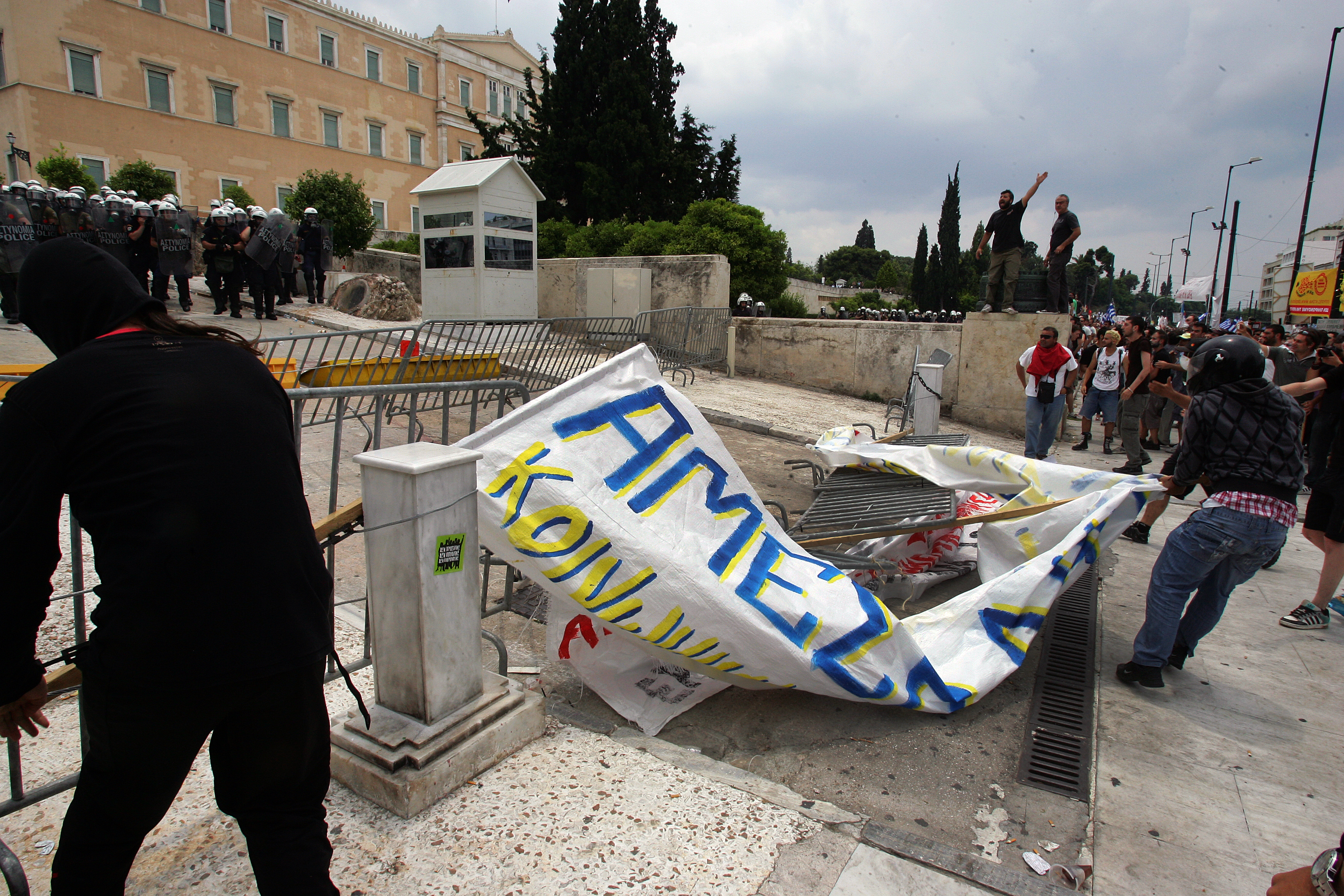 Την ίδια στιγμή τάξη επιχειρούσαν να βάλλουν και οι «αγανακτισμένοι», επιχειρώντας να απομονώσουν τις ακραίες ομάδες και να εκτονώσουν την ένταση. Ωστόσο κάποια στιγμή μέλη ακροαριστερών ομάδων κινήθηκαν προς τον Αγνωστο Στρατιώτη, όπου όλες αυτές τις ημέρες “κρατούν” ομάδες ακροδεξιών και Χρυσαυγιτών, με αποτέλεσμα να σημειωθούν συγκρούσεις και μεταξύ των διαδηλωτών.