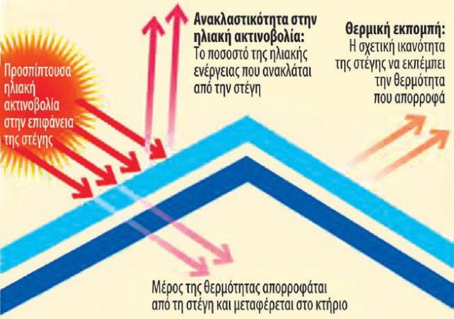 Σύμφωνα με τους ειδικούς επιστήμονες η απάντηση στον εν λόγω γρίφο βρίσκεται στις λεγόμενες «ψυχρές βαφές», δηλαδή σε ειδικά χρώματα που έχουν τη δυνατότητα να αντανακλούν την ηλιακή ακτινοβολία, μειώνοντας την επιφανειακή θερμοκρασία της στέγης και συνακόλουθα την εσωτερική θερμοκρασία των κτιρίων. Οι εν λόγω βαφές παράγονται μόλις τα τελευταία πέντε χρόνια στην Ευρώπη και ήδη έχουν οδηγήσει σε θεαματικά αποτελέσματα που μειώνουν τη θερμοκρασία του κτιρίου κατά 1-2 βαθμούς. Σύμφωνα, μάλιστα, με πρόσφατες μελέτες η παραγόμενη θερμομόνωση μπορεί να οδηγήσει σε ελάττωση της χρήσης του κλιματισμού ως και 40%, δεδομένο διόλου ευκαταφρόνητο εν μέσω κρίσης. «Οι λεγόμενες “ψυχρές στέγες” αποτελούν στην ουσία ένα πολύ απλό σύστημα, σύμφωνα με το οποίο η οροφή ενός κτιρίου βάφεται με ειδική βαφή που εμφανίζει πολύ χαμηλή απορροφητικότητα και κατ’ επέκταση αντανακλά την ηλιακή ακτινοβολία στην ατμόσφαιρα. Τόσο στις ΗΠΑ όσο και στην Ευρωπαϊκή Ένωση, η εν λόγω τεχνολογία θεωρείται από τις πλέον καινοτόμες αναφορικά με την εξοικονόμηση ενέργεια για λόγους οικολογικούς αλλά και… οικονομικούς»,