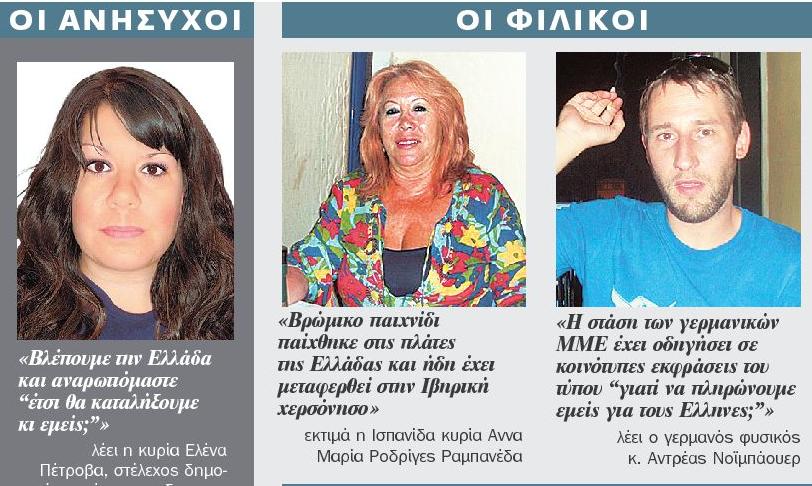 «Είναι θλιβερό ότι στα γερμανικά Μέσα οι Ελληνες παρουσιάζονται είτε ως επιθετικοί διαδηλωτές είτε ως τεμπέληδες που απλώς περιμένουν να βγουν στη σύνταξη.Θα ήθελα να διαβάσω τις ιστορίες των ανθρώπων που επιθυμούν διακαώς να δουλέψουν αλλά δεν βρίσκουν δουλειά. Των ανθρώπων που διαδηλώνουν ειρηνικά κατά χιλιάδεςκαι όχι αυτών που βάζουν φωτιές και πετούν πέτρες. Νομίζω ότι αυτή η στάση των γερμανικών Μέσων έχει οδηγήσει στις κοινότυπες εκφράσεις του τύπου “γιατί να πληρώνουμε εμείς για τους Ελληνες;”. Αντιθέτως,μιλώντας με Ελληνες και ακούγοντας τη δική τους οπτική, ένιωσα να ταυτίζομαι σε αρκετά σημεία μαζί τους» λέει στο «Βήμα της Κυριακής» ο 31χρονος γερμανός φυσικός κ. Αντρέας Νοϊμπάουερ. «Τα ιταλικά μίντια παρουσιάζουν την Ελλάδα ως τη χώρα που “κατέρρευσε” και την Ιταλία ως τη χώρα που γλίτωσε την κρίση!Κι όμως, η πραγματικότητα γύρω μου αποδεικνύει το ακριβώς αντίθετο. Χιλιάδες Ιταλοί χάνουν τη δουλειά τους, οι συνταξιούχοι ζουν με 500 ευρώ, οι μικρές επιχειρήσεις κλείνουν. Μας τοποθετούν “απέναντι” στην Ελλάδα, την Ιρλανδία και την Ισπανία,τη στιγμή που η δική τους κρίση είναι αντικατοπτρισμός της δικής μας» λέει στο «Βήμα της Κυριακής» η 26χρονη Ιταλίδα κυρία Κοστάντζα Πάσκουα, η οποία εργάζεται ως σύμβουλος Μάρκετινγκ. Στη Βρετανία, από την άλλη, η χώρα μας φιγουράρει ως… «μπαμπούλας» σε όλα τα ντιμπέιτ που αφορούν τη διαχείριση των βρετανικών οικονομικών. «Οι μισοί αναλυτές χρησιμοποιούν το παράδειγμα της Ελλάδας για να υποστηρίξουν τιςπερικοπές στις δημόσιες δαπάνες και οι άλλοι μισοί για να προωθήσουν το ακριβώς αντίθετο! Εν τέλει η χώρα σας έχει μετατραπεί σε σημείο αναφοράς για κάθε είδους πολιτική συζήτηση» λέει ο 36χρονος βρετανός οικονομολόγος κ. Γκράχαμ Χέι.