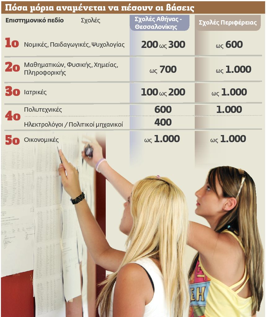 ΠΟΛΥΤΕΧΝΙΚΕΣ ΣΧΟΛΕΣ, ΙΑΤΡΙΚΕΣ, Πληροφορική και τμήματα πρώτης ζήτησης σε Αθήνα και Θεσσαλονίκη «πέφτουν» εφέτος αισθητά, όπως αποκαλύπτουν τα βαθμολογικά στοιχεία των εφετινών υποψηφίων που ανακοινώνει αύριο το υπουργείο Παιδείας. Ετσι οι υψηλόβαθμες σχολές του 2ου και του 4ου επιστημονικού πεδίου,δηλαδή οι Φυσικομαθηματικές σχολές,η Πληροφορική και οι Πολυτεχνικές, θα έχουν εφέτος χαμηλότερη βάση εισαγωγής. Πτώση θα έχουν και οι σχολές του 3ου επιστημονικού πεδίου,δηλαδή οι Ιατρικές, Οδοντιατρικές και Φαρμακευτικές σχολές, καθώς και οι Παιδαγωγικές και Νομικές του 1ου επιστημονικού πεδίου. «Θολό» όμως είναι το τοπίο όσον αφορά το 5ο επιστημονικό πεδίο των Οικονομικών Επιστημών. Οπως φανερώνουν τα βαθμολογικά στοιχεία, εντυπωσιακή θα είναι η πτώση των βάσεων στα περιφερειακά τμήματα της χώρας, ιδιαίτερα σε εκείνα που είχαν αντίστοιχα τμήματα στα μεγάλα αστικά κέντρα και τα οποία επέλεγαν τα παιδιά των τριτέκνων και πολυτέκνων οικογενειών με τη βεβαιότητα της μετεγγραφής. Σε τέτοια τμήματα μπορεί να καταγραφεί πτώση των βάσεων ως και 1.500 μορίων (π.χ. η Διοίκηση Επιχειρήσεων πανεπιστημίων και ΤΕΙ, τα τμήματα Λογιστικής των ΤΕΙ, κ.ά.).