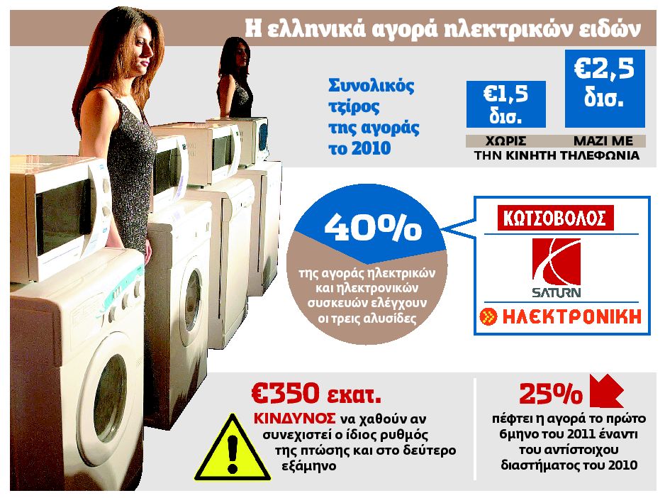 Είναι εντυπωσιακό, ωστόσο είναι γεγονός ότι οι επιχειρήσεις του κλάδου των ηλεκτρικών και ηλεκτρονικών συσκευών είναι όλες ζηµιογόνες _ τουλάχιστον οι τελευταίες οικονοµικές χρήσεις τους. Μόνο που οι δύο πολυεθνικοί όµιλοι (Κωτσόβολος-Dixon’s και Media Markt) «σαρώνοντας» την αγορά και επιβάλλοντας µια συνθήκη εξοντωτικού ανταγωνισµού «παίζουν εκ του ασφαλούς». Για πρώτη χρονιά πέρυσι (η χρήση της κλείνει στις 30 Ιουνίου) η Ηλεκτρονική ΑΕ κατέγραψε ζηµιές ύψους 15 εκατ. ευρώ, από τις οποίες λειτουργικές είναι µόνο τα 7 εκατ. ευρώ και τα άλλα 8 εκατ. ευρώ είναι η καταγεγραµµένη ζηµιά της Σερβίας.