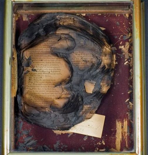 Από τα πιο εξεζητημένα εκθέματα της έκθεσης είναι οι καρβουνιασμένες σελίδες ενός αντιτύπου που είχε στην κατοχή του ο Έντουιν Φόρεστ, ηθοποιός του 19ου αιώνα. Θύμα μιας μεγάλης φωτιάς, το βιβλίο έγινε σχεδόν στάχτη. Ό,τι απέμεινε από τις καμένες σελίδες φυλάσσεται σε ειδική γυάλινη προθήκη στο Αρχείο Φόρεστ στο Πανεπιστήμιο της Πενσυλβάνια. Επειδή όμως οι πολύτιμες στάχτες ήταν πολύ ευαίσθητες για να ταξιδέψουν ως την Ουάσινγκτον, η Folger Library εκθέτει… αναπαραγωγή τους.