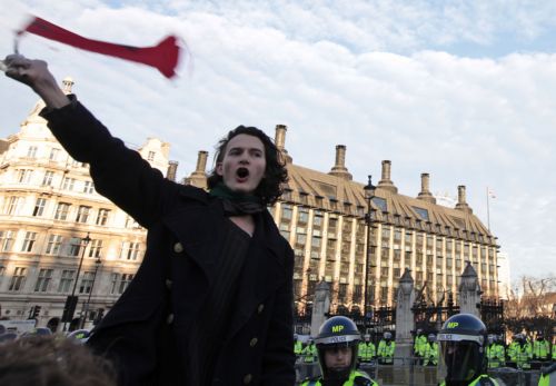 Ο 21χρονος φοιτητής στο πανεπιστήμιο του Κέιμπριτζ κρεμάστηκε από μια σημαία στο διάσημο μνημείο των πεσόντων, και στη συνέχεια πήδηξε στο καπό μιας Τζάγκουαρ της βασιλικής συνοδείας, ενώ πιο πριν είχε πετάξει ένα σκουπιδοτενεκέ στο πολυτελές αυτοκίνητο.