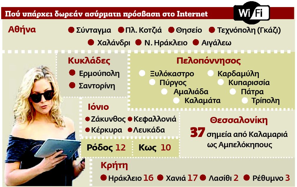 Στους τουριστικούς προορισµούς του Ιονίου υπάρχουν 10 Wi-Fi hotspots _ πέντε στη Λευκάδα, τρεις στη Ζάκυνθο και από ένα σε Κέρκυρα και Κεφαλλονιά _ ενώ στα ∆ωδεκάνησα καταγράφονται 12 hotspots στη Ρόδο σε διάφορα σηµεία του νησιού _ όπως Ρόδος, Καλλιθέα, Αφάντου, Γεννάδι, Ψίνθος, Κοσκινού, Φιλέρηµος _ και 10 στην Κω.