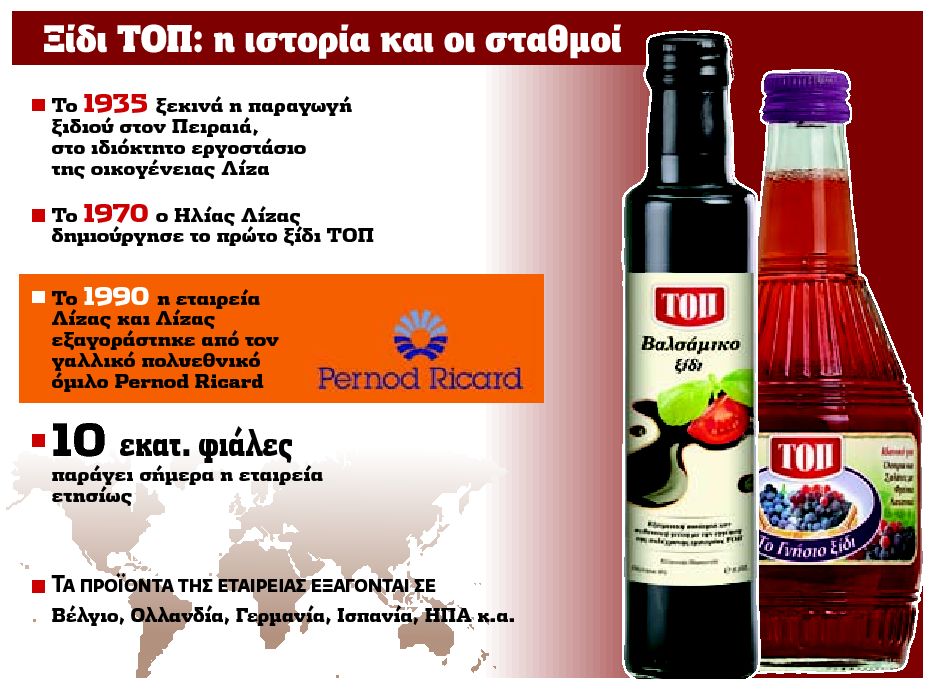 Η καλή ποιότητα στην πρώτη ύλη κρασιού βρίσκεται πίσω από το ξίδι που παρήγαγε για πρώτη φορά η οικογένεια πριν από 76 χρόνια σε ιδιόκτητο εργοστάσιο στον Πειραιά, ενώ σήµερα η κυκλοφορία του προϊόντος έχει ξεπεράσει τα ελληνικά σύνορα. Στο τιµόνι πλέον της επιχείρησης βρίσκεται ο γαλλικός όµιλος Pernod Ricard που συνεχίζει την παραγωγή στον Πειραιά. Η εξαγορά της ελληνικής εταιρείας από τον γνωστό πολυεθνικό όµιλο στον χώρο της ποτοποιίας και η δηµιουργία νέων προϊόντων, όπως το ελληνικό βαλσάµικο, έχουν διατηρήσει σταθερά ανοδικά την πορεία του ξιδιού ΤΟΠ, µε αποτέλεσµα να ξεπερνά τη σηµερινή κρίση της Ελλάδας και σήµερα να εξάγεται σε Βέλγιο, Ολλανδία, Γερµανία, Ισπανία, Ηνωµένες Πολιτείες και να παράγονται 10 εκατοµµύρια φιάλες ετησίως.