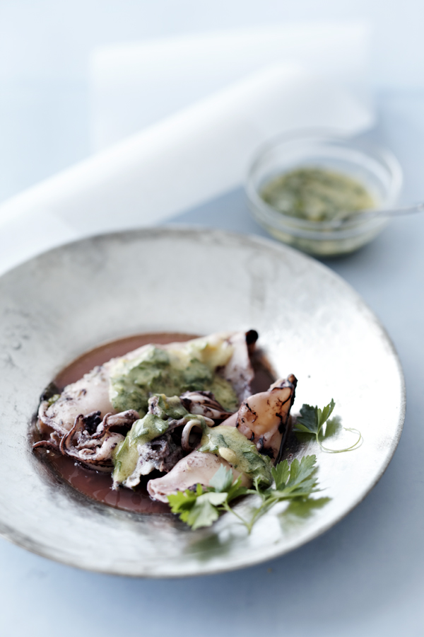 5. Χτυπάμε στο multi όλα τα υλικά της σάλτσας και περιχύνουμε τα καλαμάρια προτού τα σερβίρουμε.