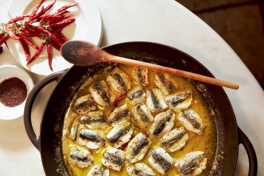Ζεσταίνουμε το ελαιόλαδο σε ένα βαθύ τηγάνι και σοτάρουμε τους σπόρους μουστάρδας σε χαμηλή φωτιά. Μόλις βγάλουν το άρωμά τους, προσθέτουμε και τα υπόλοιπα υλικά εκτός από τις σαρδέλες. Τα λιώνουμε με ένα πιρούνι και αφήνουμε τη σάλτσα να βράσει ανακατεύοντας συχνά.