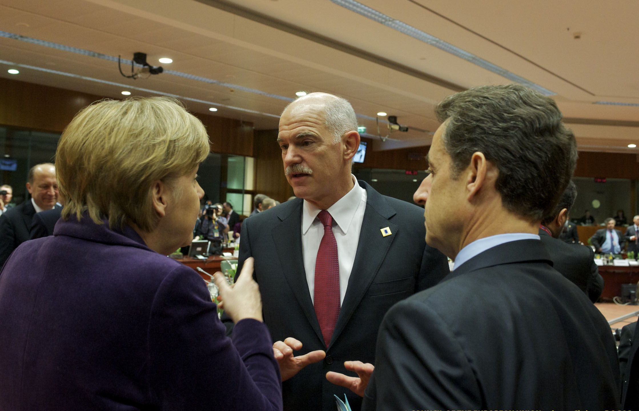 Και όταν ο φινλανδός ομόλογός του συνέχιζε να απαιτεί εγγυήσεις και ο Σλοβάκος να λέει ότι δεν μπορεί η φτωχή χώρα του να πληρώνει χωρίς αντίκρισμα για την Ελλάδα, ο κ. Παπανδρέου ύψωσε τους τόνους και φέρεται να είπε: «Τι θέλετε να κάνω για να πεισθείτε; Μήπως να βάλω ενέχυρο τα νησιά μας ή να πουλήσουμε την Πελοπόννησο;». «Αυτά τα πράγματα δεν γίνονται και το ξέρετε» φέρεται να τόνισε ο κ. Παπανδρέου και κάπου εκεί η συζήτηση φαίνεται ότι πήρε άλλη τροπή. Από εκείνο το σημείο άνοιξε η επιμήκυνση, προσφέρθηκε η ανταλλαγή των παλαιών τίτλων με νέους, πιο μακροχρόνιους, μειώθηκαν τα επιτόκια, προβλέφθηκε η επαναγορά ομολόγων στη δευτερογενή αγορά και περιελήφθη αναπτυξιακό σχέδιο τύπου Μάρσαλ. Ωστόσο κατέστη σαφές στον έλληνα πρωθυπουργό ότι προϋπόθεση όλων αυτών είναι η αυστηρή εφαρμογή, σύμφωνα με το συμπεφωνημένο χρονοδιάγραμμα, όλων των μέτρων και των προβλέψεων του Μεσοπρόθεσμου Προγράμματος.