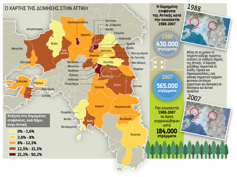 Στην Ανατολική Αττική, κυρίως σε Ανθούσα, Πικέρμι, Σπάτα, Αρτέμιδα, Παιανία και Παλλήνη, η δόμηση αυξήθηκε ως και 21%. Το ίδιο συνέβη και σε περιοχές της Δυτικής Αττικής (Μαγούλα, Ασπρόπυργος, Ανω Λιόσια και Ζεφύρι). Ανθηση στην οικοδομική δραστηριότητα παρατηρήθηκε επίσης σε Κρυονέρι, Ανοιξη, Δροσιά, Νέα Ερυθραία, καθώς και στη Νέα Μάκρη, όπου την εικοσαετία 1988 – 2007 η τσιμεντοποίηση αυξήθηκε ως και 12,5%. Ασφαλτος και τσιμέντο κατέλαβαν φυσικές επιφάνειες σε Μαρούσι, Βριλήσια και Βάρη, όπως και στις περιοχές Αμπελάκια και Σελίνια Σαλαμίνας. Τα στοιχεία αυτά κατέδειξε μελέτη του Ινστιτούτου Υπολογιστικών Μαθηματικών στο Ιδρυμα Τεχνολογίας και Ερευνας (ΙΤΕ) της Κρήτης και του Τμήματος Φυσικής του Πανεπιστημίου Αθηνών.