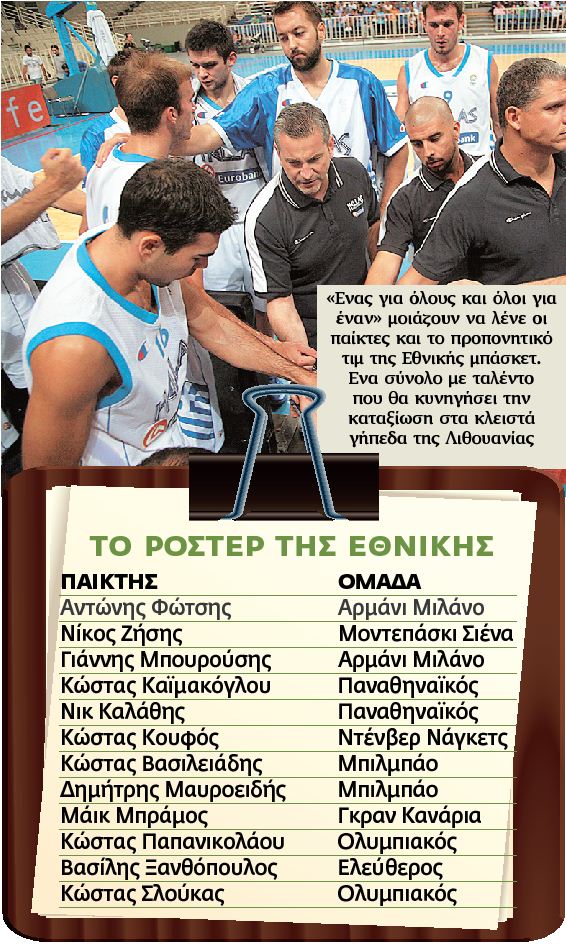 Οι 12 διεθνείς έχουν συνειδητοποιήσει πως ορισμένα από τα μεγαλύτερα αστέρια του ευρωπαϊκού μπάσκετ δεν θα είναι μαζί τους στη Λιθουανία. Απαντες αντιλαμβάνονται το μέγεθος της αξίας τους, αλλά έχουν συνηθίσει στην ιδέα ότι σε αυτή τη διοργάνωση ταξιδεύουν με εντελώς ανανεωμένο προφίλ και με την καθοδήγηση μόλις τριών αθλητών της λεγόμενης «παλαιάς φρουράς» (Αντώνης Φώτσης, Νίκος Ζήσης, Γιάννης Μπουρούσης ).