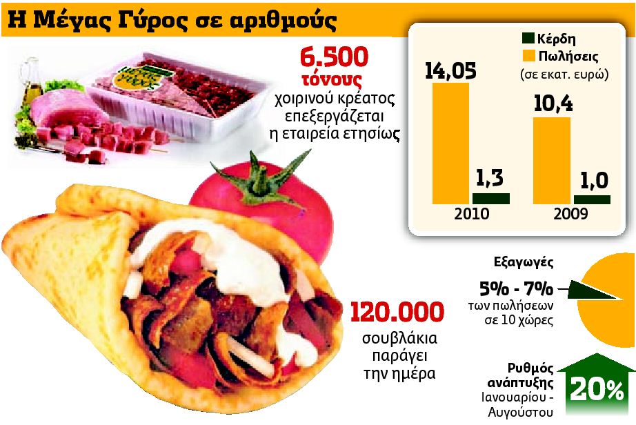 Το 2010 οι πωλήσεις της ανήλθαν στα 14,05 εκατ. ευρώ, έναντι 10,4 εκατ. ευρώ το 2009, και τα κέρδη της στα 1,3 εκατ. ευρώ από 1 εκατ. ευρώ τον προηγούµενο χρόνο, ενώ εφέτος οι πωλήσεις της – στο διάστηµα Ιανουαρίου – Αυγούστου – «τρέχουν» µε ρυθµό αύξησης 20%. Ο φιλόδοξος στόχος του κ. Νίκα, που πιστεύει ότι είναι δυνατόν να πραγµατοποιηθεί, είναι οι πωλήσεις της εταιρείας να φθάσουν στα 50 εκατ. ευρώ. Την τελευταία περίοδο, λέει ο κ. Λούστας, «προσπαθούµε να κατοχυρώσουµε στην αγορά το καλαµάκι σουβλάκι ως επώνυµο προϊόν («καλαµάκι µε ονοµατεπώνυµο»)», ενώ παράλληλα προσπαθεί να δώσει έµφαση στην εξαγωγική δραστηριότητα. Οι εξαγωγές της Μέγας Γύρος ΑΕ είναι ακόµη περιορισµένες – αντιστοιχούν µόλις στο 5%-7% στο σύνολο των πωλήσεων – και γίνονται σε 10 χώρες (Κύπρος, Βουλγαρία, Ρουµανία, Τσεχία, Γερµανία, Γαλλία, Ιταλία, ∆ανία, Ισπανία και Βρετανία). Η εταιρεία επεξεργάζεται ετησίως περί τους 6.500 τόνους χοιρινού κρέατος – παράγει 120.000 σουβλάκια την ηµέρα –, σήµερα απασχολεί 95 εργαζοµένους από 24 εργαζοµένους που απασχολούσε πριν από τέσσερα χρόνια και «κάθε χρόνο επενδύουµε, εφέτος έχουµε επενδύσει 1 εκατ. ευρώ» προσθέτει ο κ. Λούστας.