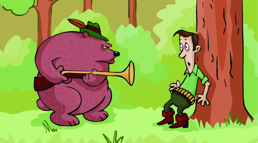 – Να σας πω μια ιστορία… Ήταν ένας φίλος μου κυνηγός, …ο οποίος καθώς έφευγε αφηρημένος από το σπίτι του μια μέρα, αντί να πάρει το όπλο του, πήρε κατά λάθος την ομπρέλα. Αφού περπατούσε για κάμποση ώρα στο δάσος, είδε μπροστά του ξαφνικά μια άγρια αρκούδα. Σηκώνει λοιπόν την ομπρέλα του και κάνει να πυροβολήσει, και τσαφ, να σου η αρκούδα …. πέφτει κάτω νεκρή. Τέζα.