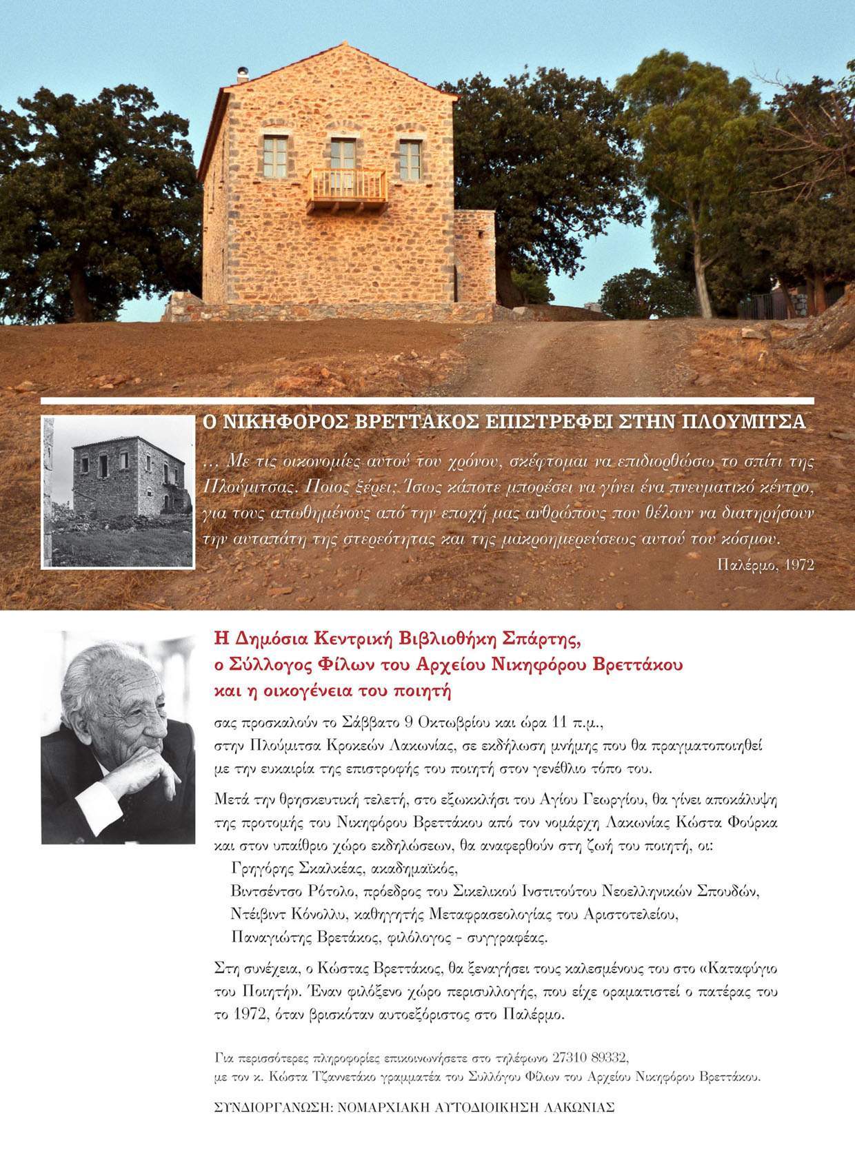 Το πατρικό σπίτι του Νικηφόρου Βρεττάκου στην Πλούμιτσα της Λακωνίας λεηλάτησαν άγνωστοι την περασμένη Παρασκευή 23 Σεπτεμβρίου. Η οικία είχε ανακαινισθεί τελευταία – ολοκληρώθηκε τον περασμένο Οκτώβριο – από την οικογένεια του ποιητή και τον Σύλλογο «Οι Φίλοι του Αρχείου Νικηφόρου Βρεττάκου», προκειμένου να λειτουργήσει ως «Καταφύγιο του ποιητή».