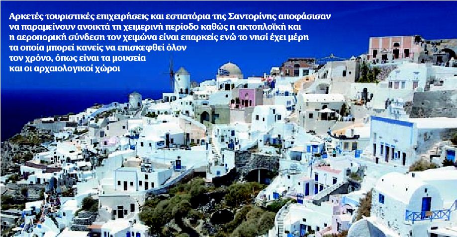 «Για να έρθει ο τουρίστας πρέπει πρώτα από όλα να είναι ανοικτές οι επιχειρήσεις» λέει ο κ. Κ. Κωνσταντινίδης, πρόεδρος και διευθύνων σύµβουλος της εταιρείας Ηλιότοπος ΑΕ που διαχειρίζεται το οµώνυµο ξενοδοχείο στο Ηµεροβίγλι της Σαντορίνης. Με αυτή την άποψη συντάσσονται περισσότερες από 20 τουριστικές επιχειρήσεις και εστιατόρια του νησιού, που αποφάσισαν να παραµείνουν ανοικτά τη χειµερινή περίοδο ή τουλάχιστον στο µεγαλύτερο µέρος της. Για το «τόλ µηµα» αυτό καταλυτική ήταν και η ιδιαίτερα καλή πορεία της εφετινής σεζόν, αλλά και το γεγονός ότι η Σαντορίνη είναι ένας διεθνώς αναγνωρίσιµος προορισµός. Παράλληλα η επιµήκυνση της σεζόν «είναι πιο εύκολη» στη Σαντορίνη, σηµειώνει ο κ. Κωνσταντινίδης, µια και το νησί έχει ήδη «πολύ µεγάλη περίοδο». Οπως εξηγεί, «οι επιχειρήσεις της Σαντορίνης είναι πιο µικρής κλίµακας, οικογενειακές, και µπορούν να λειτουργήσουν και εκτός της υψηλής σεζόν, ενώ και η ακτοπλοϊκή και η αεροπορική σύνδεση της Σαντορίνης τον χειµώνα είναι επαρκείς». Το νησί έχει µέρη τα οποία µπορεί κανείς να επισκεφθεί όλον τον χρόνο, όπως είναι τα µουσεία και οι αρχαιολογικοί χώροι. Εξάλλου και ο αρχαιολογικός χώρος στο Ακρωτήρι αναµένεται να ανοίξει ξανά εφέτος µετά το 2005 που είχε κλείσει. Από την άλλη, διαρκώς αυξάνονται οι κινέζοι τουρίστες, οι οποίοι προτιµούν «να ταξιδεύουν εκτός της υψηλής θερινής περιόδου», όπως τονίζει ο κ. Κωνσταντινίδης, ενώ πολλοί είναι και οι γάµοι Κινέζων που τελούνται στο νησί. Ηδη ο Σεπτέµβριος κυλά µε πληρότητα 100%, µε τον Οκτώβριο να κινείται σε «πολύ ικανοποιητικά επίπεδα», ενώ και για τον χειµώνα έχουν πραγµατοποιηθεί κρατήσεις, αναφέρει ο κ. Κωνσταντινίδης. Χαρακτηριστικό είναι ότι οι περισσότερες κρατήσεις, πάνω από 70%, είναι µεµονωµένες και γίνονται µέσω Internet, ακόµη και από τους κινέζους επισκέπτες.