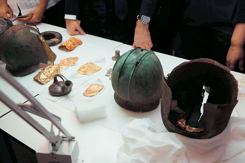 Στο μεταξύ, στο Εθνικό Αρχαιολογικό Μουσείο όπου φυλάσσεται ο μακεδονικός θησαυρός συνεχίζεται η συντήρηση των αντικειμένων – χάλκινα κράνη, χρυσές προσωπίδες και χρυσά κοσμήματα, ασημένια και χάλκινα κύπελλα κ.ά.- ώστε να αντιμετωπισθούν άμεσα οι φθορές τους από τον χρόνο αλλά και από την παραμονή τους έξω από το κλειστό σύνολο, τους τάφους δηλαδή, όπου ήταν εγκλεισμένα. Μετά από την πρώτη συντήρηση αναμένεται η επίσημη παρουσίασή τους οπότε και θα δοθούν στη δημοσιότητα περισσότερα στοιχεία γι΄ αυτά. Υπενθυμίζεται εδώ, ότι παρά το γεγονός, ότι οι αρχαιολόγοι είναι βέβαιοι για την προέλευσή τους, που προσδιορίζεται κάπου στις περιοχές της Πέλλας, δεν έχει εντοπισθεί ακόμη ο ακριβής τόπος της λαθρανασκαφής, κάτι που μπορεί βεβαίως να προκύψει και από την ανάκριση των δύο συλληφθέντων.