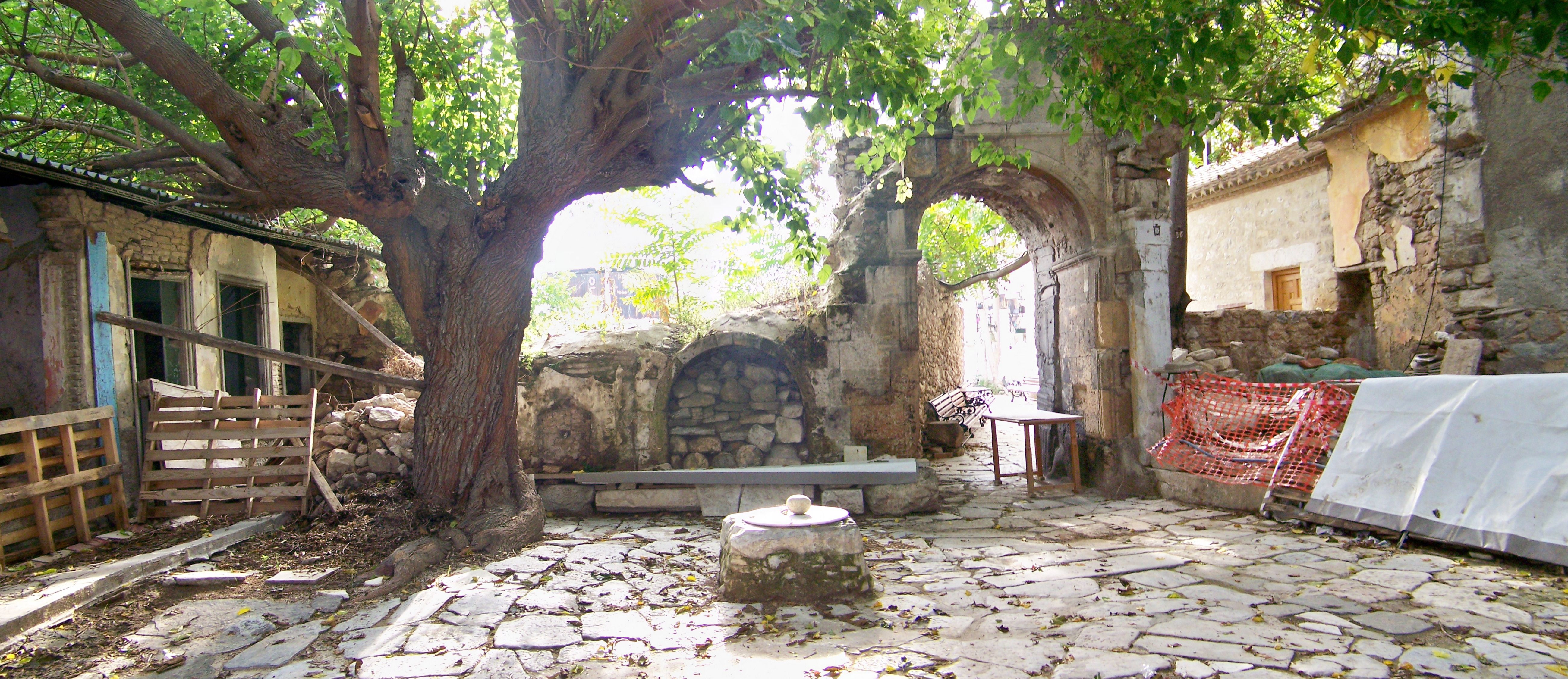 Ερειπωµένα, φτωχικά κτίσµατα, σκάλες που δεν οδηγούν πουθενά, τοίχοι που στέκονται χωρίς νόηµα, ξύλα, σίδερα, σπασµένα γυαλιά, σκουπίδια και ακαθαρσίες παντού. Ενα πηγάδι χάσκει στο κέντρο της Αυλής, µαρµάρινα αρχιτεκτονικά µέλη, όπως σπόνδυλοι από κίονες, βρίσκονται διάσπαρτα. Εικόνα που προκαλεί απελπισία.