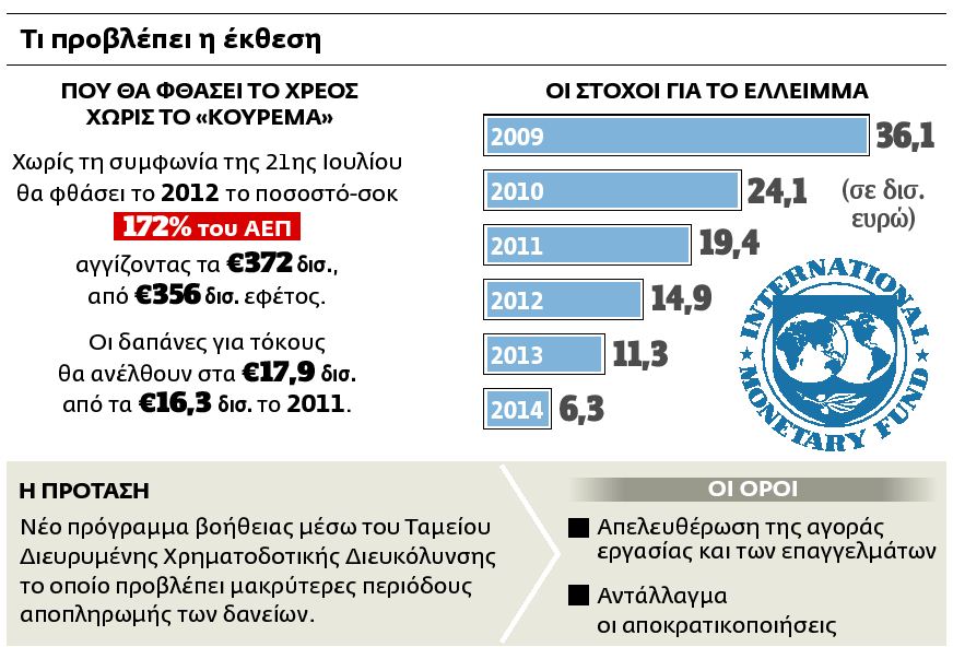 Η µακρά νύχτα που ξεκίνησε µε την είσοδο της χώρας µας στο ΔΝΤ τον Μάιο του 2010 θα κρατήσει τέσσερα ακόµη χρόνια. Μετά την Ευρωπαϊκή Επιτροπή που διαπίστωσε στην έκθεσή της ότι η Ελλάδα δεν κατάφερε να αντιµετωπίσει την κρίση παρά µόνο να «φρενάρει» το έλλειµµα, δεν προχώρησε σε κρίσιµες διαρθρωτικές αλλαγές στην οικονοµία, δεν έκανε ιδιωτικοποιήσεις και δεν µπορεί να εξυπηρετήσει το χρέος της, και το ΔΝΤ στην δική του έκθεση χαρακτηρίζει την Ελλάδα ως τη χώρα που βρίσκεται στη δίνη του κυκλώνα – «Greece, the country in the eye of the storm» – που σαρώνει την ευρωζώνη. Στην έκθεση που θα δοθεί στη δηµοσιότητα µετά τις πολιτικές αποφάσεις που αναµένεται να ληφθούν στις συνόδους κορυφής της ευρωζώνης (σήµερα και την Τετάρτη) το ΔΝΤ προτείνει λύση τριών σηµείων: