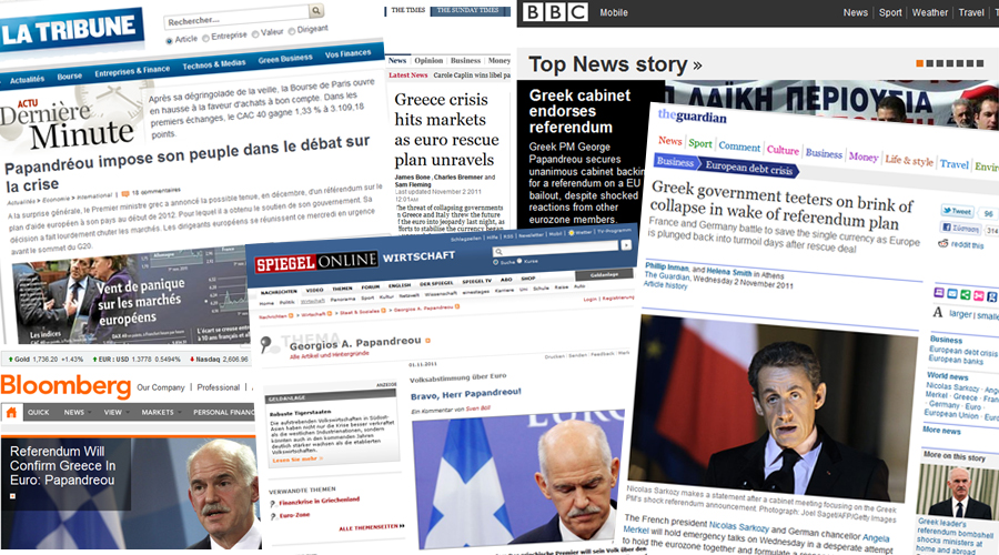 «Ενα κύμα πανικού σάρωσε τον κόσμο χθες, από το Τόκιο έως τη Γουόλ Στριτ, διά μέσου Παρισιού και Μιλάνου, μετά από μία ανακοίνωση-έκπληξη από τον έλληνα πρωθυπουργό το βράδυ της Δευτέρας για δημοψήφισμα σχετικά με την ευρωπαϊκή διάσωση της χώρας του. Το στοίχημα του Γιώργου Παπανδρέου έπιασε εξ απήνης όλους τους ηγέτες της Ευρωπαϊκής Ενωσης» αναφέρει ο συντάκτης της Liberation.